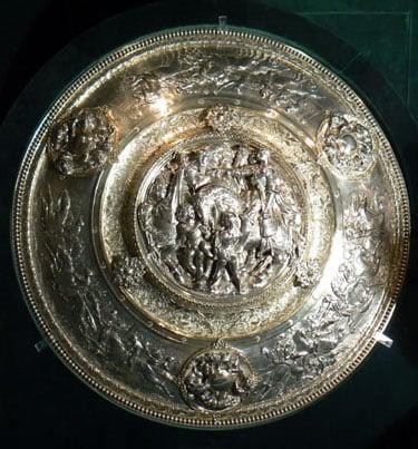 This is the cup for 1865 and was won by Ackworth, owned by 4th Marquis of Hastings.. Only one or two were made in form of a shield. The circular relief in the centre depicts the meeting of Bolingbroke and the Earls of Westmorland and Northumberland at Doncaster in 1339.
