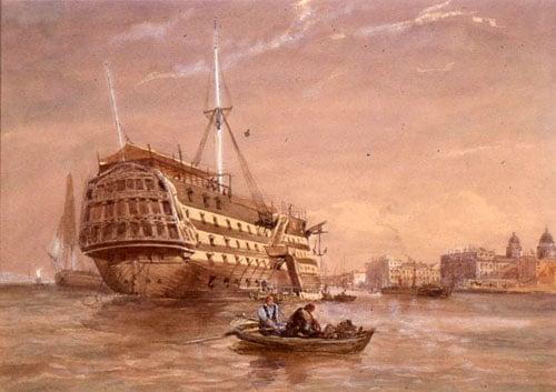 Between 1830-57, the seaman's hospital ship, the 'Dreadnought' was used as a seaman's hospital and lay off Greenwich. Bought as a memorial by parents and friends of a young member of the Art Fund and an Old Etonian killed in a car crash in 1967, Adrian Mark Palmer. Picture chosen because the family had been seafaring.