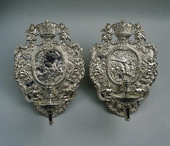 Two sconces from a set of six, one depicting Diana and Actaeon, the other Prometheus bound. Commissioned by Lord Warrington for the Great Bedchamber at Dunham Massey. Archambo was an eminent Huguenot goldsmith.