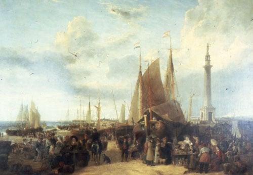 The Dutch Herring Fair at Yarmouth was a feature of the Grand Fishery, on which for many centuries the Dutch supremacy in herring fishery and curing was based. In the foreground, hucksters with their stalls do business with the Dutch fishermen. The Nelson monument stands on the left, and the Yarmouth windmills are visible in the middle distance behind the jetty.