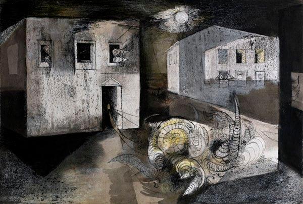 This work is part of a series titled 'Destruction of the Human City' which respond to the urban devastation wrought by the air raids of the early 1940s. These landscapes are emotional and inspired by other artists of the period particularly the Neo-Romantics who sought inspiration from Samuel Palmer and William Blake. This is evident in the nocturnal, moonlit setting of the drawing. The strong texture, variety of media, lighting and simplified buildings are all characteristic of John Piper's work. The seemingly unpeopled landscape demonstrates the influence of Graham Sutherland. This scene of imagined urban devastation compliments the museums existing depictions of bomb damage and fits in well with works by Neo-Romantics like Piper, Sutherland and John Minton.