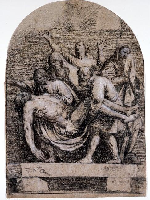 A very rare drawing by one of the French followers of Caravaggio. The composition derives from Caravaggio's 'Entombment', but the figures are more personal than direct copies.
