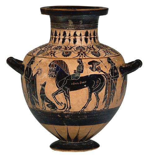 Black-figure vase. Three handled water jar depicting a young man on horseback flanked by two youths.