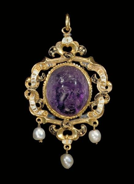 A late antique amethyst cameo with a head of Medusa, probably 5th century AD, in a setting of interlaced scrolls in gold enamelled in black, white and blue, probably English.