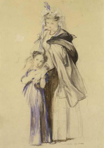 A little girl, waiting to have her ears pierced, standing with her mother. Sketch for the picture already in the Tate.