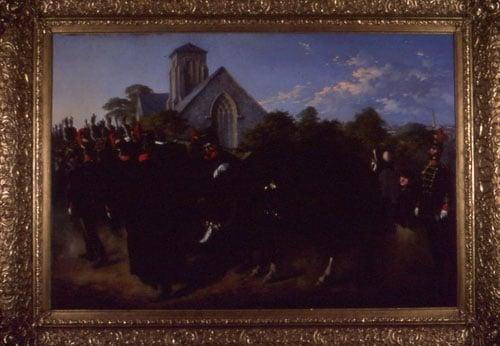 Much about this large painting remained obscure. The artist was unknown, and the church where the Colonel was buried had not been identified, though it was presumed to be somewhere in the Guildford area. Nonetheless the picture is an unusual record of a regimental occasion, and is interesting in the context of military history in showing the difference in dress between mounted, dismounted and pall-bearer troops on parade. The Colonel's horse is seen prominently in the foreground, draped in black, with his master's boots reversed in the stirrups.
