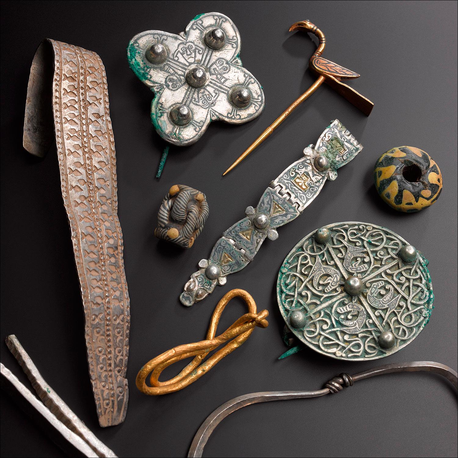The vessel, made and finely decorated in a Carolingian or Byzantine workshop, is extremely rare, and the only one ever found complete with its lid. The objects discovered inside include five decorative glass beads, silver-mounted pendants, and a silver-mounted rock-crystal ball, which might already have been centuries old when it was buried.