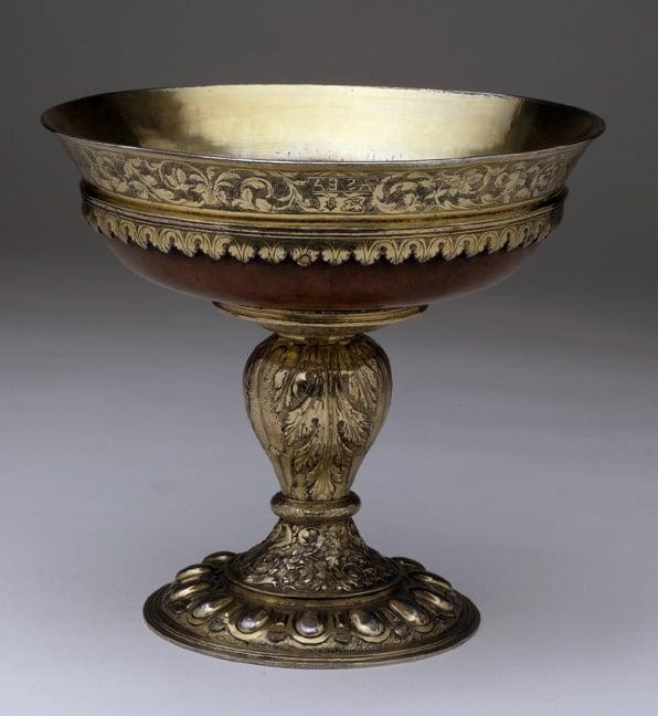 The Galloway (standing) Mazer or drinking vessel. The maplewood bowl rests on a collar over a baluster stem chased with acanthus fronds on tooled ground and a compressed knop. The circular foot is repousse with a band of cupids among foliage.