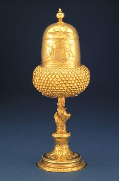 Cup with the bowl in the form of an acorn. The upper portion is a detachable cover, surmounted by a baluster finial. Inscribed 'This cup left to ye Church of Stapleford by ye Rt. Honble Bennet Earl of Harborough who departed this life Octr 16 1732.' Donor's arms and crest engraved on the upper part of the bowl.