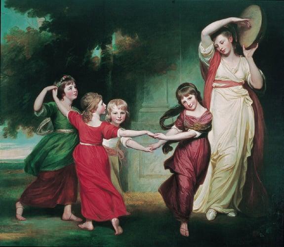 This famous painting, charming in sentiment and neo-classical in design, shows the children of Granville, 2nd Earl Gower, afterwards first Marquess of Stafford. The four dancing children are by his third wife, Lady Susannah Stewart, while to the right stands Lord Gower's daughter by his second marriage. Romney started his career in Kendal in the Lake District and returned there to die.