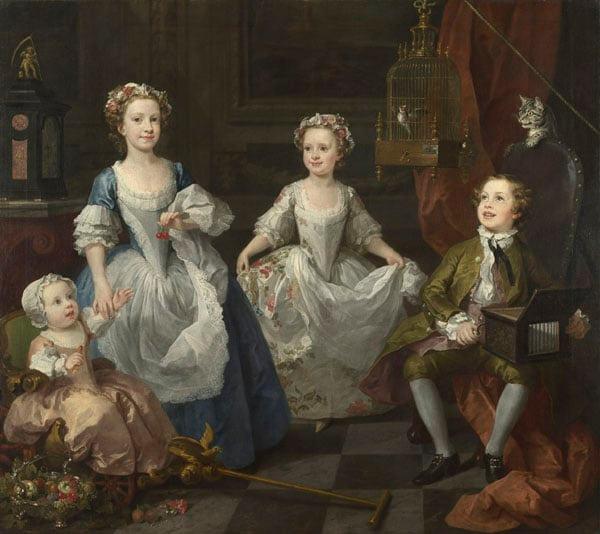 The Graham children are three girls and a boy, the children of Daniel Graham, apothecary to Chelsea Hospital. Exquisitely dressed and posed in a semicircle yet a lively and cheerful group. The boy has a bird organ, the baby is in a go cart, one girl is about to dance. A cat looks at a birdcage. Signed W Hogarth pinx 1742.