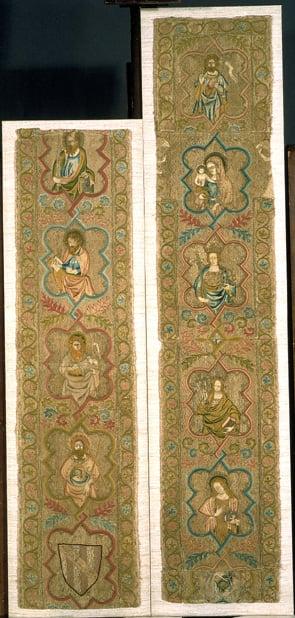 Two panels, Linen embroidered in silver gilt and coloured silks. They show half figures of saints in barbed quatrefoils. 1) 152 x 23 cm. 2) 170 x 23 cm.