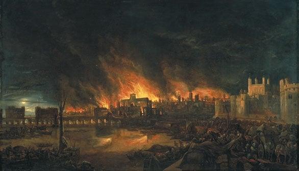 Panoramic view of the conflagration. The artist may have been an eye witness to the Fire as it is an entirely accurate record of the scene on the night of 4 September 1666. The viewpoint is unusual, but the best and safest for the artist.
