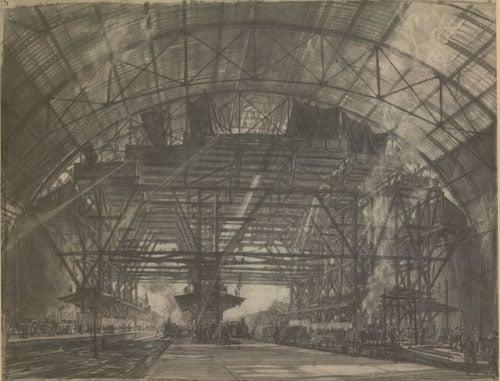 An architectural drawing of Charing Cross Station during the reconstruction of the roof caused by an accident on December 5th, 1905. This drawing was presented by fifteen subscribers who desired that an important example of the artist's work should be secured for the nation.