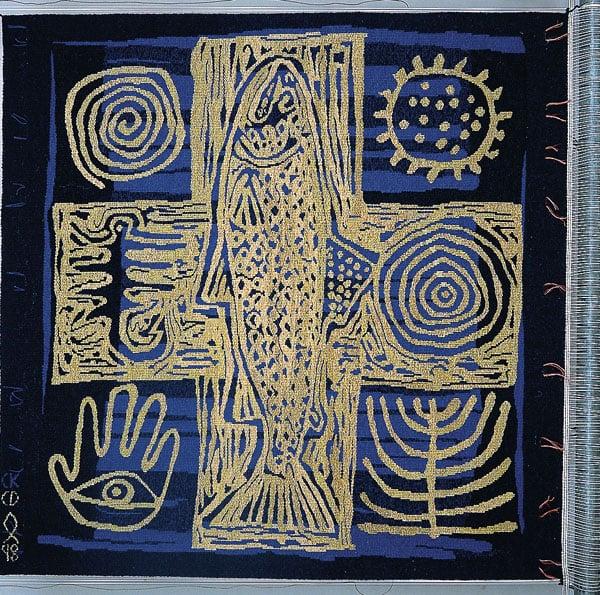 Tapestry woven by Carol Dunbar to a design by Colin Kirkpatrick. The vertical profile of a fish is contained in a cross which spans the height and width of the tapestry.