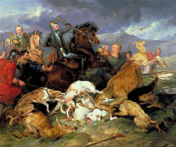 A narrative scene illustrating the Ballad of Chevy Chase, giving prominence to hounds killing deer, with Earl Percy and huntsmen behind.