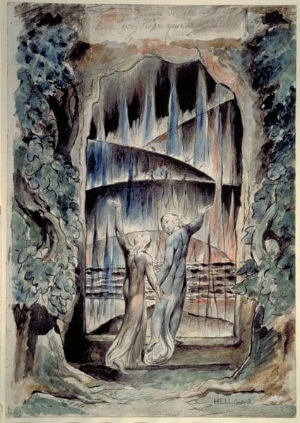 A drawing from the series to illustrate Dante's 'Divine Comedy' depicting Dante accompanied by the Roman poet Virgil, who is dressed in blue, symbolising wisdom. Few of the Dante drawings were completely finished, and only seven engraved, but the series is one of the biggest undertaken by Blake and the last legacy of his imagination.
