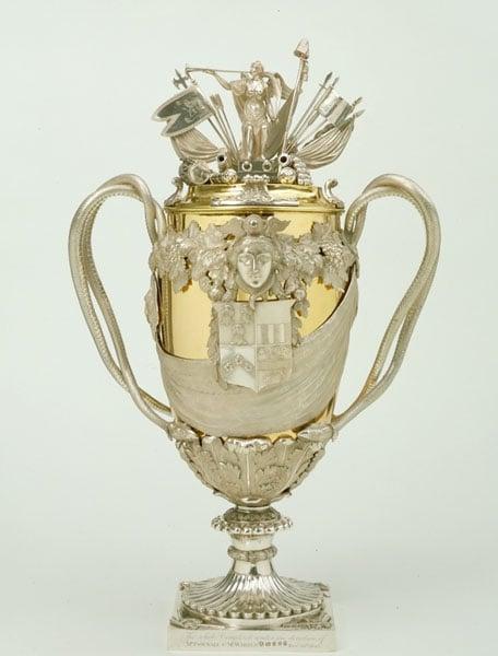 Parcel-gilt silver cup in its original wooden box. The cup is inscribed with a tribute to Aubert, signed by the engraver, John Roper, and the foot is engraved.