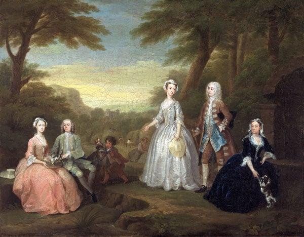 Group portrait of the family of Robert Jones II (1706-42), son of Robert Jones, MP for Glamorgan. Robert Jones II stands to the right. His mother is shown in dark blue, seated to the right with her spaniel. His younger brother Oliver is seated to the left and adjacent are their sisters Mary and Elizabeth. The background figures of a boy struggling with a monkey and haymakers disporting themselves strike an ironic contrast with the decorum of the family group.