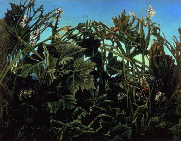 This work is a twist on a Matisse work by the same name. In contrast to the joyous nature of the Matisse, Ernst spreads his entangled leaves and tendrils across the picture, so that they appear locked in combat, and populates this death trap with praying mantises. Lost in this sinister world is a diminutive human being (upper right) alongside a crouching beast. This predatory jungle is an expression of the artist's outrage at the worsening political situation in Europe during the 1930s.