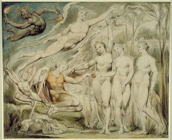 This watercolour depicts a triple-headed Discord flying off; Mercury floating on the air; Cupid exults as he handles his arrows; Paris, languidly seated, seems almost to shrink from the decision which he is in the act of making. The three Goddesses, as well as the other figures, are splendid in form; and the whole design belongs to the highest order of Blake's work, both in spirit and in treatment. This watercolour is part of a collection of works by William Blake belonging to the late Graham Robertson and was included in his sale at Christie's in 1949. Graham Robertson, painter, author and theatrical designer, was widely known as a Blake collector. At his death in 1948 he bequeathed 4 Blakes to the Nation; the rest of the collection was to be disposed of by auction. He had, however, left a very considerable estate to be given to charities. This allowed his Executors to instruct the auctioneers that some of the drawings should be acquired for certain museums up to defined limits. In this way 20 works, totalling £40,281 were given by the Executors, through the Art Fund, to 6 public collections.