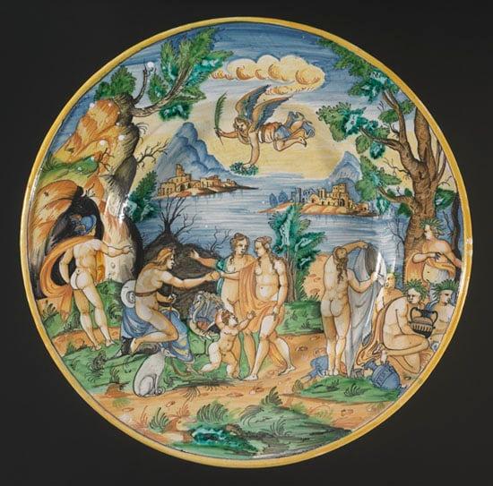 The design is copied in reverse from a famous Italian engraving of circa 1510-20 by Marcantonio Raimondi after Raphael, which was copied by Marco da Ravenna. Impressions of both prints are in the British Museum. Marcantonio's print was greatly admired in Italy and had a long history of use by Italian maiolica painters in the 16th Century. This plate is particularly important as it is signed by Lefebvre, a known maker from Nevers, France and documents the way in which Italian Renaissance maiolica tradition was taken to France by Italian potters and developed in Nevers.