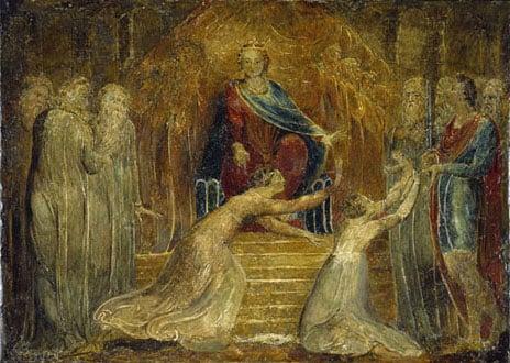 This painting is part of a collection of works by William Blake belonging to the late Graham Robertson and was included in his sale at Christie's in 1949. Graham Robertson, painter, author and theatrical designer, was widely known as a Blake collector. At his death in 1948 he bequeathed 4 Blakes to the Nation; the rest of the collection was to be disposed of by auction. He had, however, left a very considerable estate to be given to charities. This allowed his Executors to instruct the auctioneers that some of the drawings should be acquired for certain museums up to defined limits. In this way 20 works, totalling £40,281 were given by the Executors, through the Art Fund, to 6 public collections.