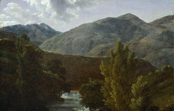 Bidauld painted many open-air studies of this mountainous region between Rome and Naples during his five years in Italy. The artist preferred unprepossessing desolate sites in his Italian landscapes. He used mottled brushwork and intricate colour harmonies of grey, green and brown to depict the hills, mountains, clumps and meandering rivers.