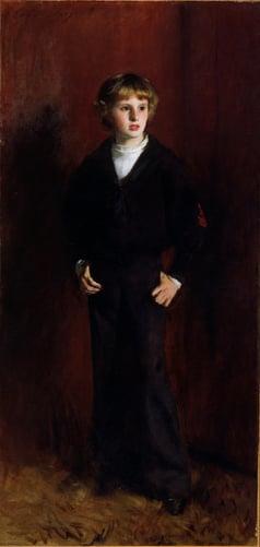 Full length portrait of Major C E Harrison, of the Rifle Brigade, as a boy. Dressed in a sailor-suit and bare-headed.