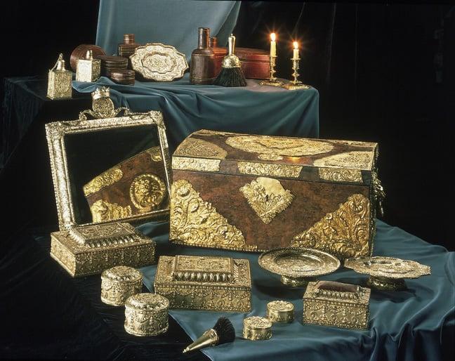 18 pieces including the oak veneered with walnut travelling case. All except the candlesticks bear the mark of Vincent Fortier as Fermier-General (1672-79). Maker's mark PF with fleur-de-lys associated with Pierre Flamand.