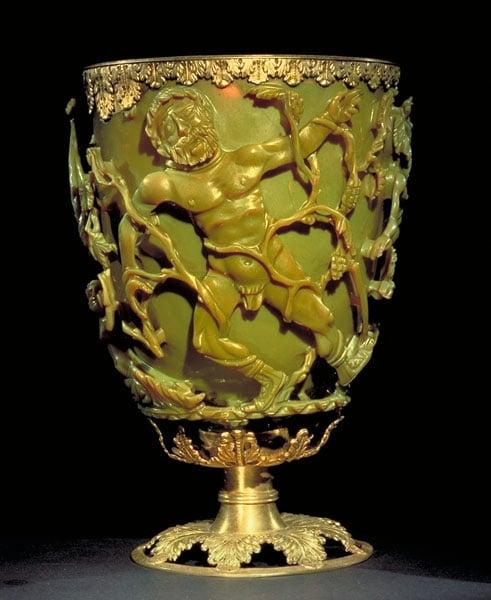This remarkable cup depicts an episode from the legend of Lycurgus, King of the Thracians. After angering the god Dionysus by driving him to the depths of the sea, Lycurgus attacked his maenads, one of whom - Ambrosia - was saved by Mother Earth, who transformed her into a vine. The scene shows Lycurgus struggling to escape from her clinging tendrils. Tiny amounts of colloidal gold and silver in the glass give it unusual properties; it appears opaque and pea-green in reflected light, but it becomes deep wine red if held up to the light. It was probably originally used as a lamp. It is the sole complete surviving example of this type of glass, technically known as dichroic.