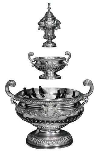 Silver cistern, fountain and wine cooler. Each piece is very large, heavily decorated and depicts the Parker arms. This work was acquired with assistance from the Wolfson Foundation.