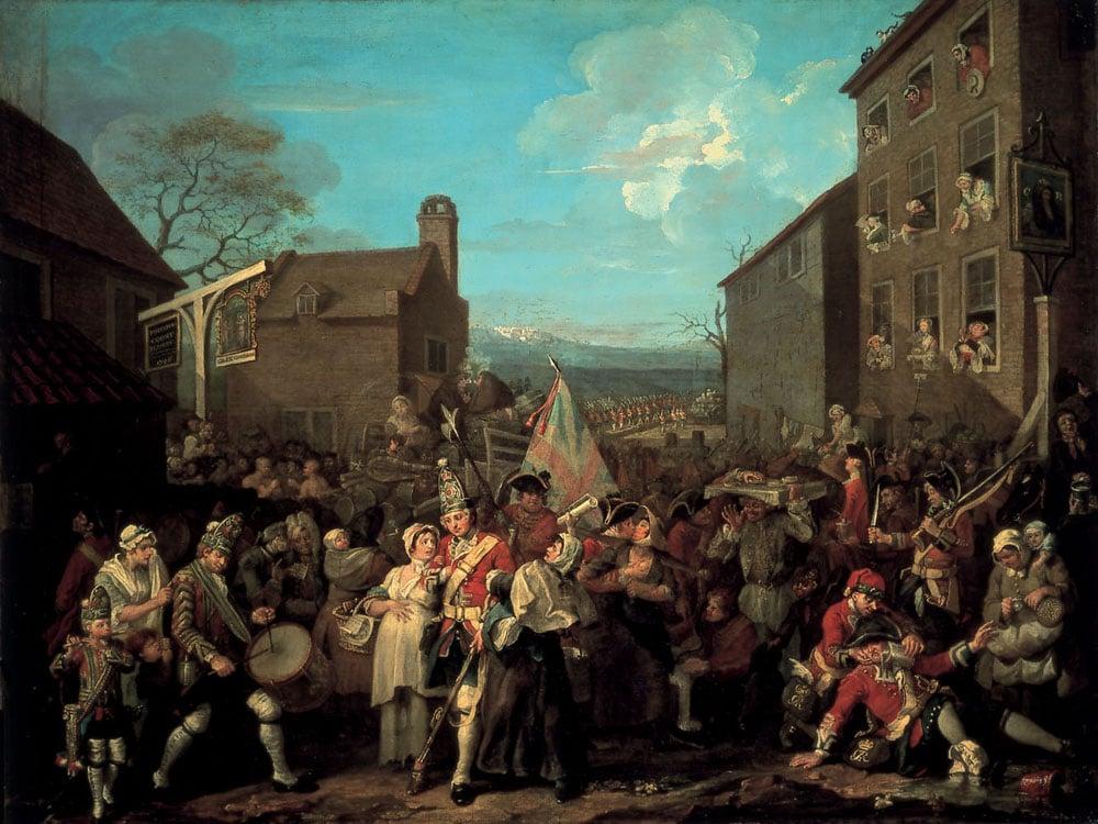 A conversation piece which depicts the English guards setting out to protect London from the threat of Bonnie Prince Charlie. The Young Pretender had landed in Scotland and marched as far south as Derby. The English guards are assembling at Tottenham Court Road Turnpike before proceeding north past the village of Finchley. This work was acquired with assistance from the Wolfson Foundation.