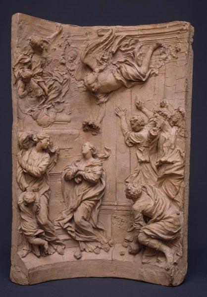 Bozzetto for altarpiece at the church of Sant' Agnese in Piazza Navona, Rome. Depicts Sant'Emerenziana being stoned to death when praying beside the grave of St Agnes. Marble altar piece was unfinished at artist's death so this maquette provides the original design.