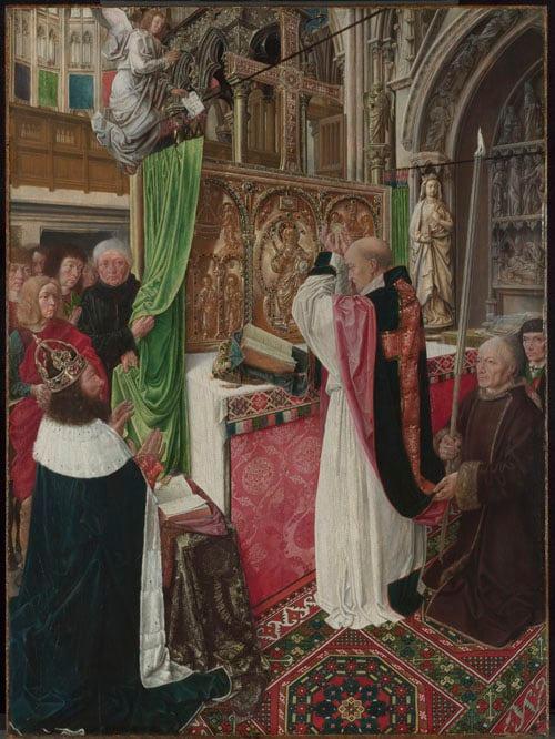 The saint officiates and raises the host, Charles Martel kneels at his side wearing La Sainte Couronne. An angel hovers holding a scroll. On the back of the panel is St Peter in grisaille. Part of a diptych or polyptich.