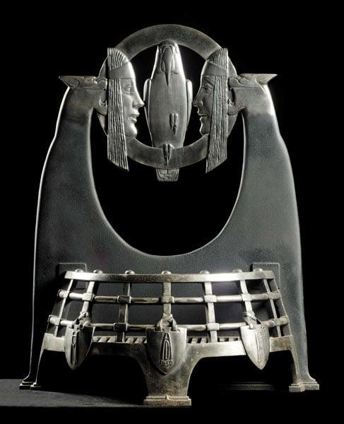 The fire basket formed an integral part of an opulent interior designed for Mulberry House, the Melchett's home. It related directly to the relief 'Scandal' that hung above the fireplace, a humourous reference to the couples earlier 'menage à trois' with a writer. At the back of the fire basket, two snarling cats are depicted hiding behind female masks to signify the 'double face' and 'cattiness' of society gossip. In the centre is a macaw, a satire on the idea of 'parroting' phrases without thought for content or meaning.
