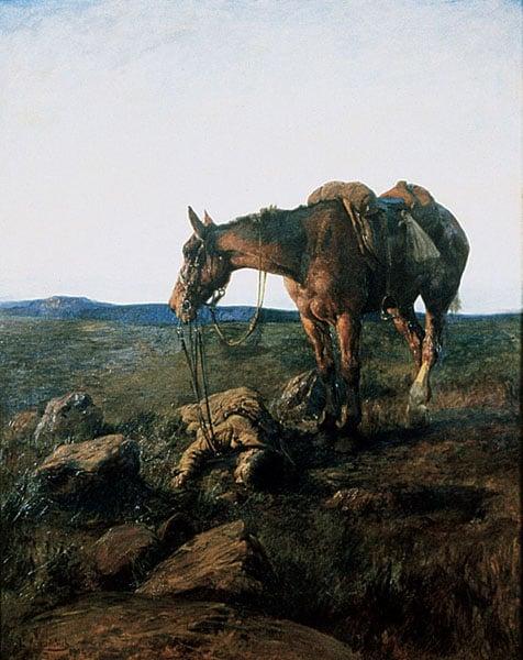 It depicts a dead soldier from the Boer War with his faithful horse standing guard over his body. There is no sentimentality but an identification with the horse's plight. The picture is in portrait form and this, with the tight trapezoid form of horse and rider, emphasises the isolation of the figures in the vast expanse of the veldt.