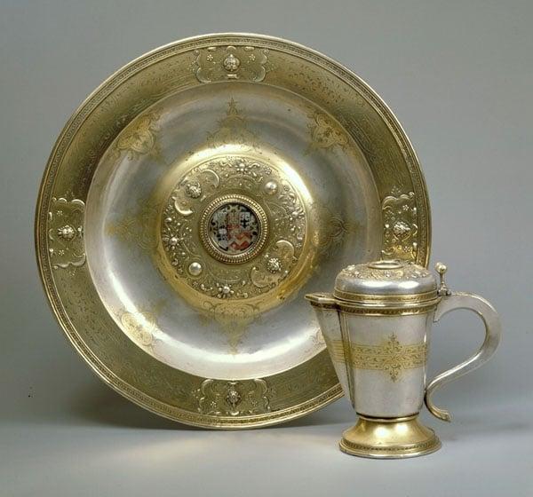 Engraved with interlacing moresques. The enamelled armorials set in the boss of the basin are those of Mostyn. Made in Bruges. Ewer 21cm h. Basin 49 cm, diam.