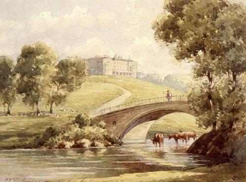 Signed and dated J D Harding 1828.The west side of the Mote House, and the park in the foreground, sloping down to the lake, with cattle under the bridge.
