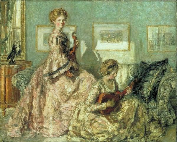 The painting shows the same model, a Miss Bennett, in two different poses, both playing the mandolin. The sofa and background are from the artist's studio.