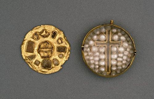 A golden capsule reliquary containing beneath a domed crystal, a relic of the True Cross in a field of pearls and accompanied by a golden relic plate, now loose. The prominence of St. Ninian makes it virtually certain that the reliquary was made for a church in North Britain, probably one of the few Premonstatensian houses in the north, such as Alnwick or Easby.