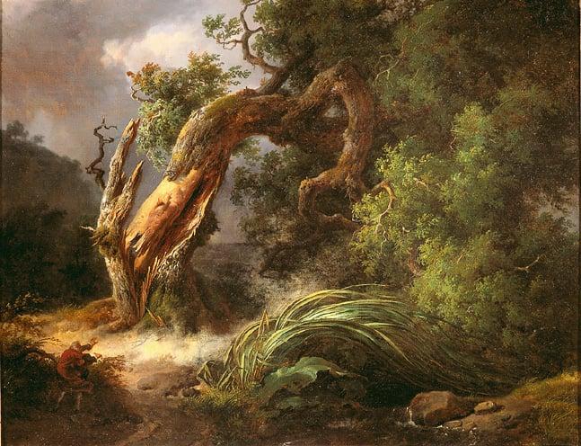 The handling of the paint shows a nice contrast between the realistic depiction of the blasted oak where Michallon is clearly indebted to the example of Jacob Ruisdael, and the fluid freedom of the reed with its decorative quality reminiscent of Boucher.The subject matter of the painting is taken from a fable by La Fontaine and, noting the year it was painted, 1816, it is hard not to conclude that it was chosen as a commentary on the fall of Napoleon.