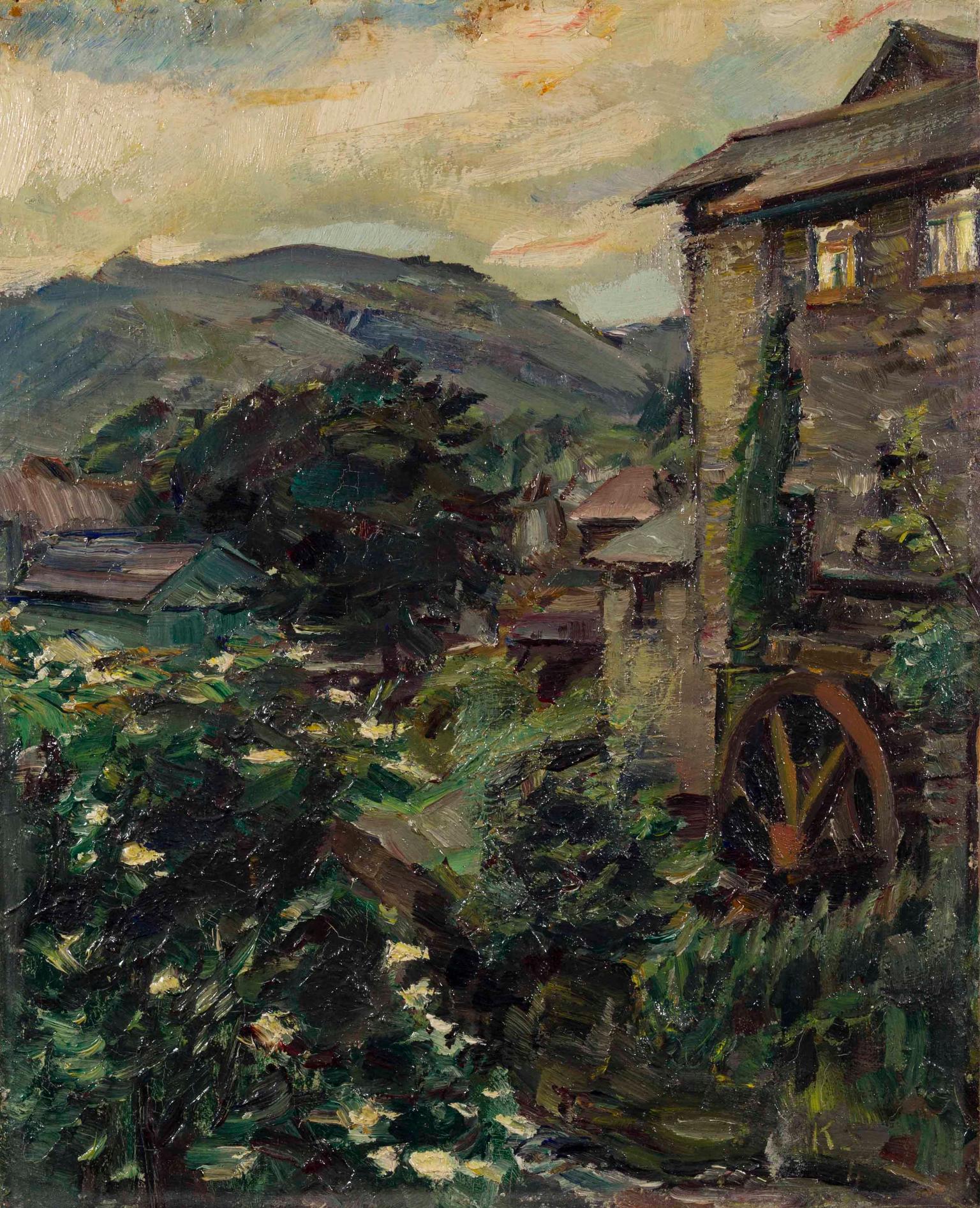 Created by an artist best for his collages, this figurative work shows the Old Mill and surrounding hills of Ambleside, the Cumbrian village where Kurt Schwitters lived from 1945. After his status as a ‘degenerate artist’ in Nazi Germany resulted in a threatened arrest by the Gestapo, Schwitters began an exile that would take him to the Lake District via Norway, Scotland and the Isle of Man. After suffering a stroke, his ill health prompted a permanent move to Ambleside, where he was buried in 1948 after being granted British citizenship the day before his death. The rolling hills of the lakes had a profound impact on Schwitters’ later works, both in the increasingly organic forms of his abstract pieces and in his increasing move towards figurative painting. One of Ambleside’s most famous landmarks, the Old Mill on Stock Ghyll was one of the town’s last surviving watermills. Schwitters renders the mill in freely handled impasto, capturing the immediacy of his experience. In the middle distance, the grey slate rooftops of the former fulling mill can be seen against the dark backdrop of Loughrigg Fell, while the lemon sky is flecked with red.