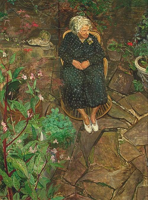 The old woman is sitting in a basket chair among tubs of flowering plants in a paved garden. She faces to the front with her head turned slightly to the right.