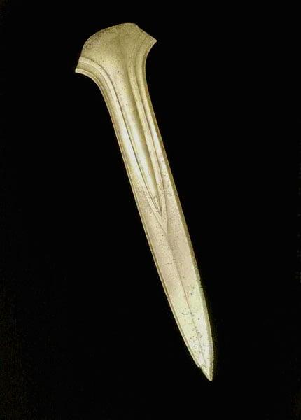 This is in the style of early Bronze Age dirks, but is very large and heavy, and the blade is deliberately blunt. It was not intended to be practical but rather for ceremonial use.