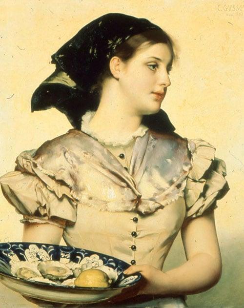 Half-length portrait of girl in cream bodice and dark headscarf, holding dish with oysters. Technique is photographic.