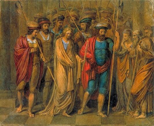 Jane Shore, a barefoot maiden with flaxen, curly hair, is in the centre, wrapped in a sheet and carrying a taper in her left hand. She is surrounded by guards and there is a group of three spectators to the right. This watercolour is part of a collection of works by William Blake belonging to the late Graham Robertson and was included in his sale at Christie's in 1949. Graham Robertson, painter, author and theatrical designer, was widely known as a Blake collector. At his death in 1948 he bequeathed 4 Blakes to the Nation; the rest of the collection was to be disposed of by auction. He had, however, left a very considerable estate to be given to charities. This allowed his Executors to instruct the auctioneers that some of the drawings should be acquired for certain museums up to defined limits. In this way 20 works, totalling £40,281 were given by the Executors, through the Art Fund, to 6 public collections.