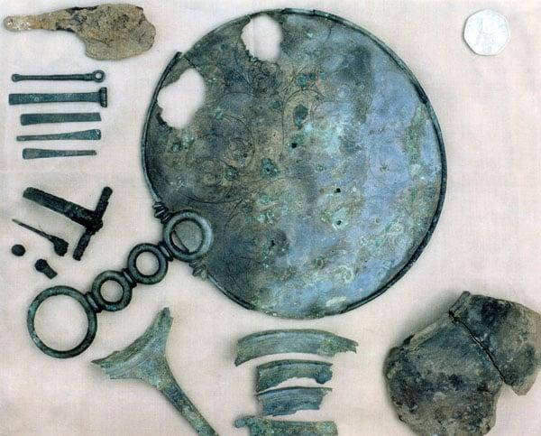 Composed of cast and hammered bronze parts with engraved and chased design on the mirror back. Probably individually composed for the owner and suggests her high social status.