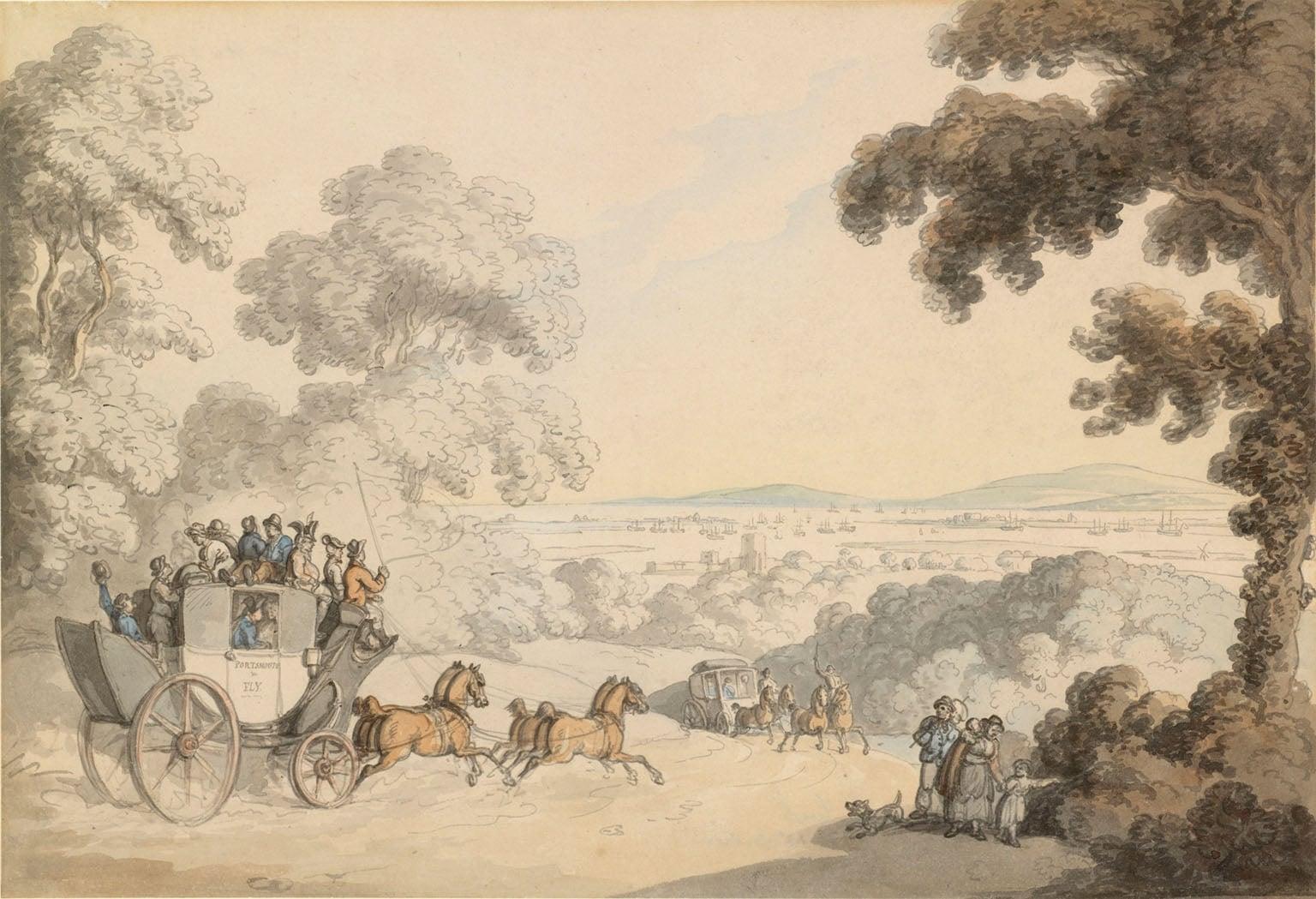 Rowlandson's painting shows the 'fly', a fast horse-drawn carriage crammed with people, heading towards Portsmouth down the London Road. The background captures some of the city's iconic sights, including Southsea Castle, Portsea Island and Portchester Castle.