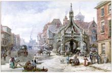 This large watercolour depicts a lively view of the Poultry Cross and the adjacent street scene. The picture provides valuable insight into the activity, costume and architecture of the period. Rayner specialised in features scenes in old cathedral cities and market towns, notably Edinburgh, Chester and London.